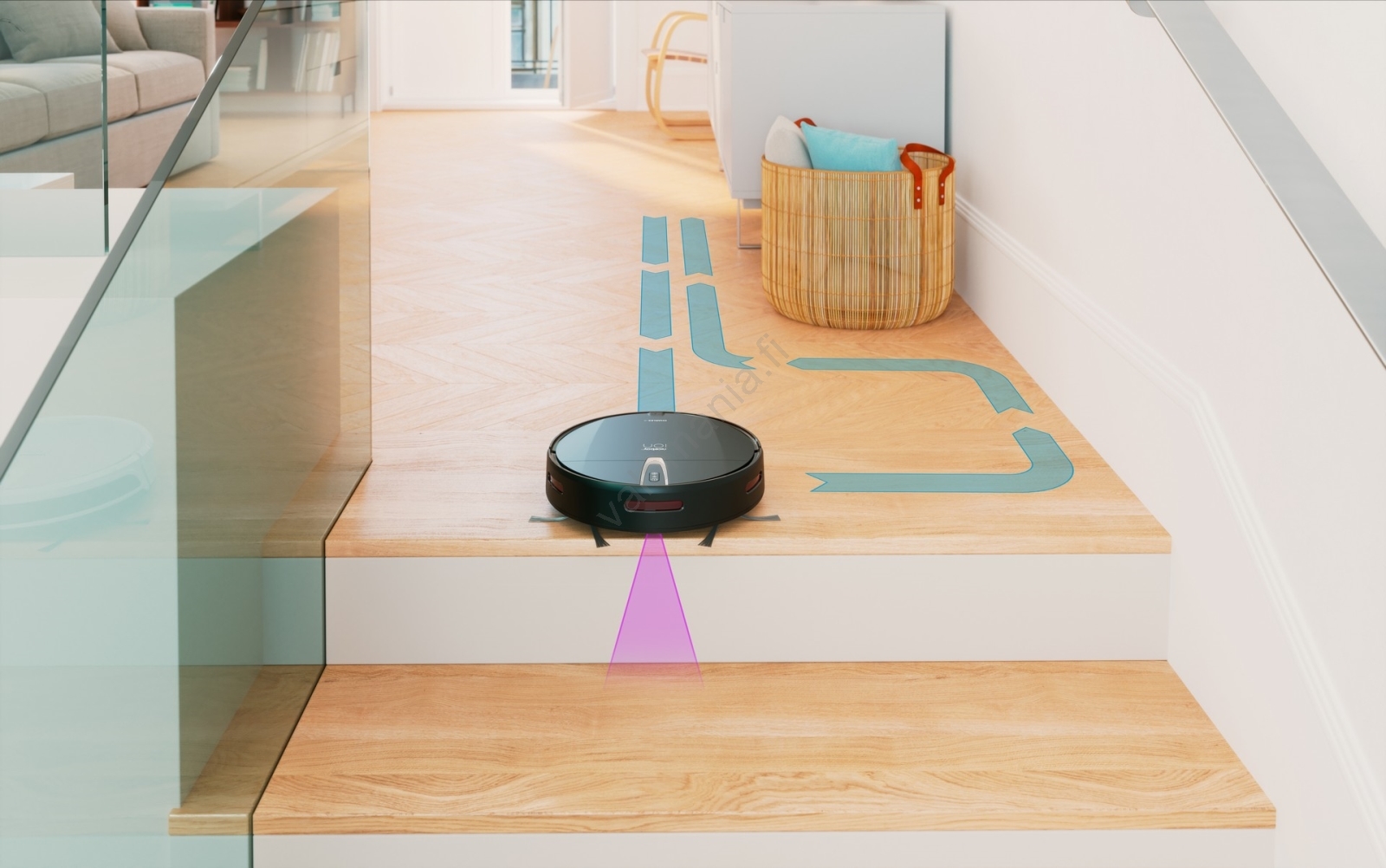 • Gyroskooppisensorit kartoittavat tilan, ja imuri suunnittelee algoritmien avulla reitin, joka kattaa 100 % siivousalueesta.
