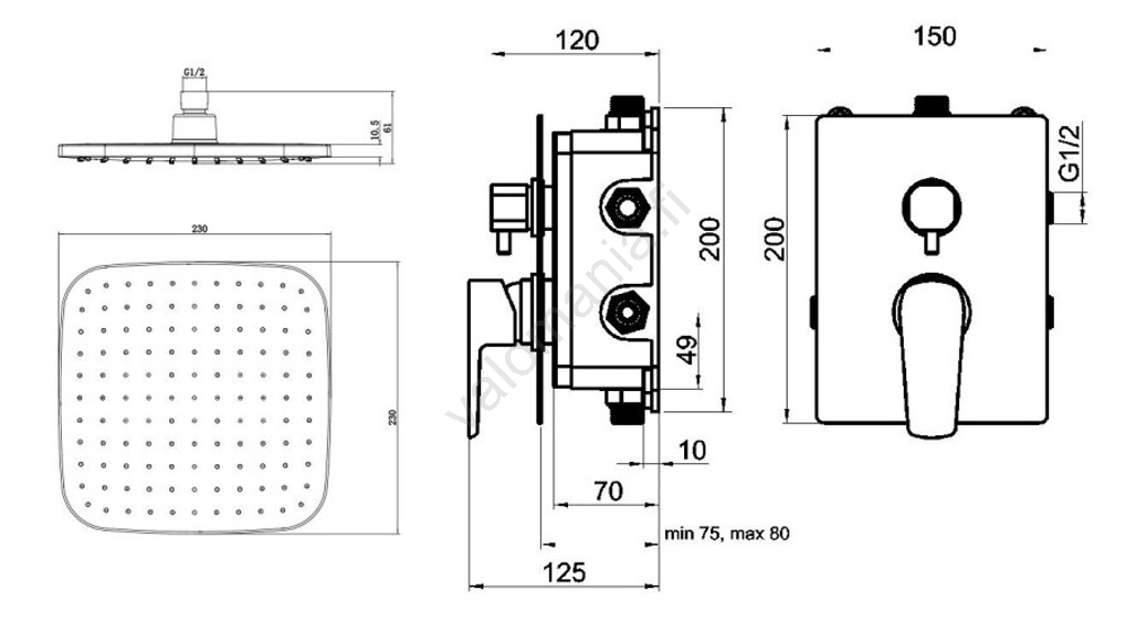 • Pakkauksessa: upotettava hana kartussilla, 3-asentoinen käsisuihku, kulmikas seinävesilähtö käsisuihkutelineellä, metallinen suihkuletku kiertymisenestolla, pääsuihku varrella.