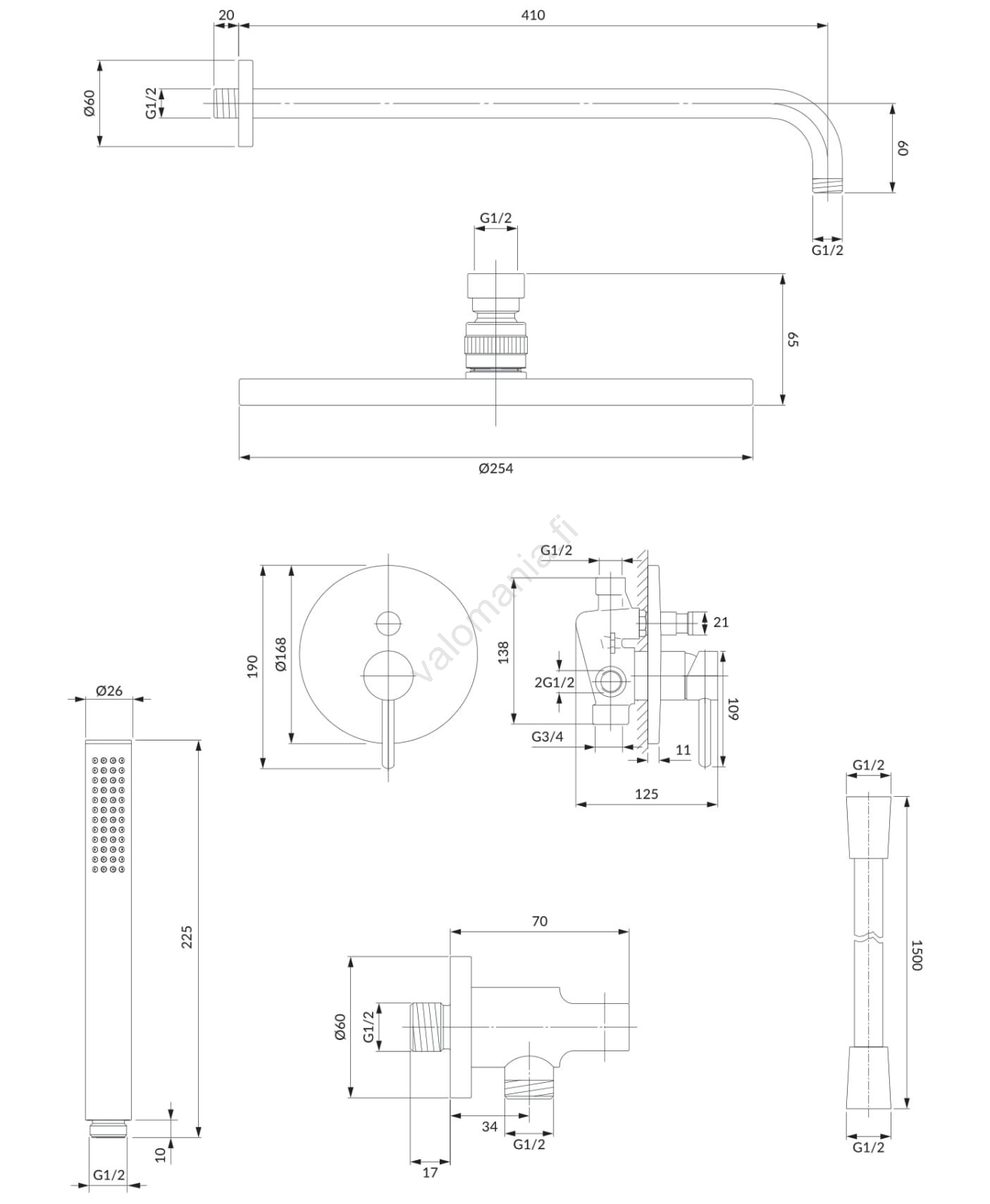 • Setti sisältää: messinkisen suihkusekoittajan, messinkisen suihkupään, messinkisen käsisuihkun (1 toiminto), ruostumattoman suihkuletkun, messinkisen suihkukulman käsisuihkutelineellä.