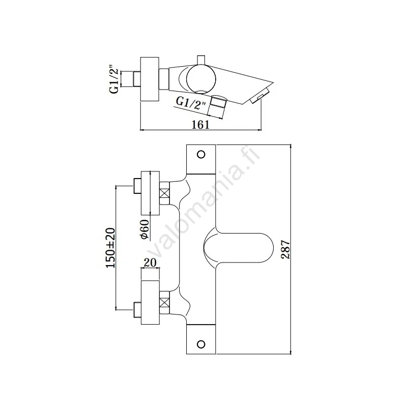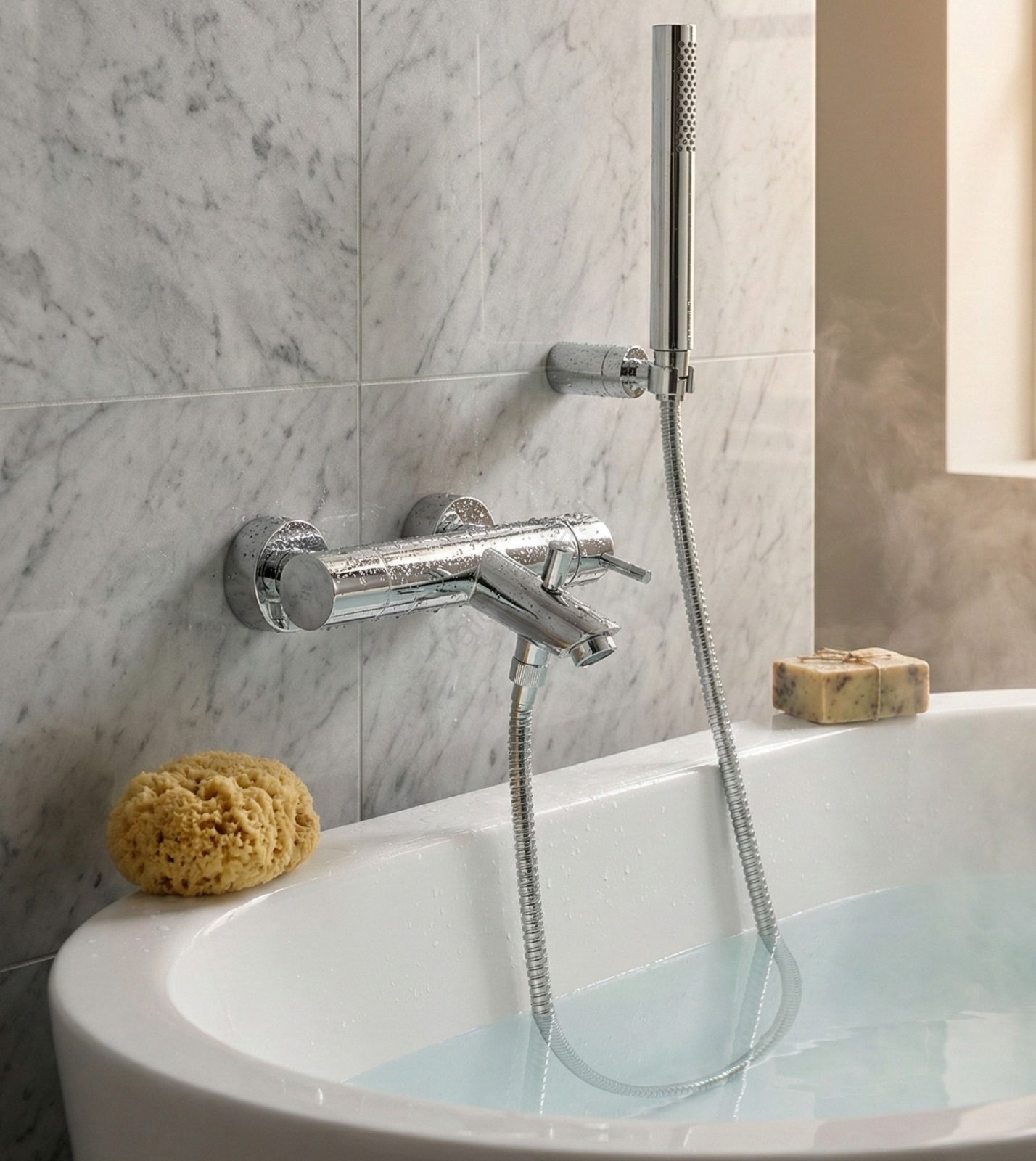 • Termostaattinen seinään asennettava ammehana suihkusetillä.
