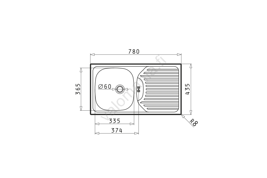 • Ruostumattomasta teräksestä valmistettu allas valumatasolla ilman hanan reikää.