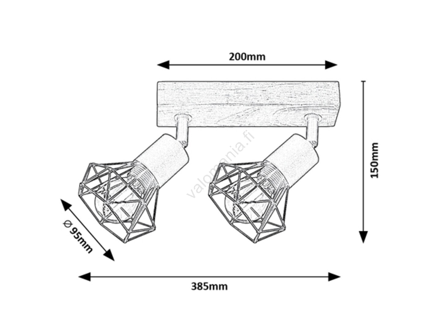 Zeus-kaksoiskohdevalaisin teollisella tyylillä sopii eri huoneisiin asunnossasi: voit asentaa sen olohuoneeseen, ruokailutilaan, keittiöön tai makuuhuoneeseen. Metallista ja puusta valmistettu valaisin kiinnitetään seinään tammen neliönmuotoisella koristeellisella jalustalla. Metalliset ritilävarjostimet, joilla on tunnusomainen muoto, ovat mattamustia. Zeus-valaisimeen sopii kaksi enintään 40W tehoista lamppua. Kannatintyyppi on E14. Makuusi ja asennuspaikan mukaan voit valita valonlähteen lämpimän tai luonnollisen valkoisen valon värisävyllä. Esimerkiksi makuuhuoneessa lämmin valkoinen valo luo kodikkaan ja intiimin tunnelman. Zeus-kaksoiskohdevalaisimen mitat ovat: leveys 385 mm, korkeus 150 mm, etäisyys seinästä 150 mm. Tämä malli toimitetaan ilman valonlähdettä.
