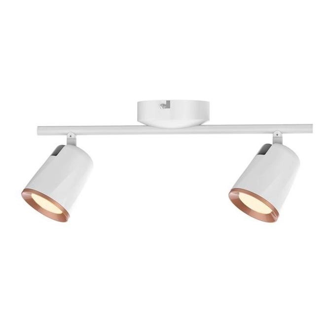 Kaksipäinen Solange-spottivalaisin erottuu modernilla, tyylikkäällä muotoilullaan ja hillityllä ulkonäöllään. Metallinen spottivalaisimen runko, joka on valmistettu valko-kultaisessa värimaailmassa, täydentyy yksinkertaisilla sylinterimäisillä metallisilla varjostimilla. Säädettävien valaisinpäiden ansiosta valon suuntaa voi ohjata halutulla tavalla. Lämminvalkoista valoa säteilevä Solange-valaisin sopii erinomaisesti moniin sisustuksiin: voit asentaa sen olohuoneeseesi, makuuhuoneeseesi tai vaikka käytävälle. Tässä mallissa on integroidut LED-valonlähteet, joiden kokonaisteho on 12 W, valovirta 760 lumenia ja käyttöikä 20 000 tuntia. Valonlähteiden värilämpötila on 3 000 K. Kaksipäisen spottivalaisimen mitat ovat: leveys 405 mm ja pyöreän koristeellisen pohjalevyn halkaisija 100 mm. Solange-valaisin toimitetaan viiden vuoden takuulla.