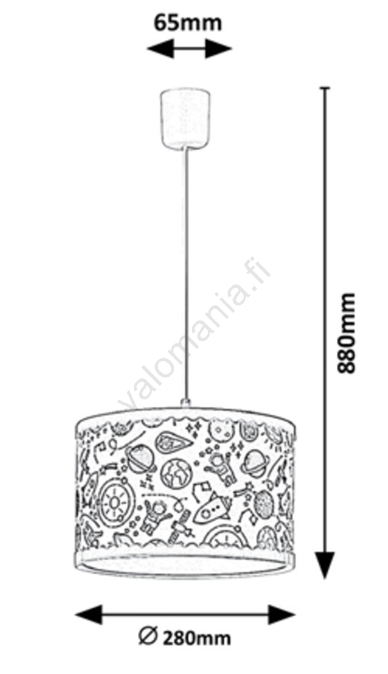 Taianomainen lastenvalaisin Hanka voi olla keskeinen kaluste jokaisen pojan huoneessa. Tämä upea astronauttiteemainen riippuvalaisin on suunniteltu itse Rabaluxin toimesta. Kokomuovinen riippuvalaisin on valmistettu sylinterimäisellä varjostimella ja sylinterimäisellä koristeellisella jalustalla. Varjostimen ylä- ja alareunassa on sininen reunus, ja sen pinta houkuttelee kaikkia pieniä poikia jännittävillä planeettojen, satelliittien ja astronauttien kuvioilla. Hanka-valaisimeen sopii enintään 40 W:n hehkulamppu, kanta on E27. Jos haluat luoda lastenhuoneeseen intiimin ja kodikkaan tunnelman, valitse tähän valaisimeen lämmin valkoinen valonlähde. Hankka-lastenvalaisimen mitat ovat seuraavat: varjostimen halkaisija 280 mm, etäisyys katosta 880 mm, asennushalkaisija 65 mm.