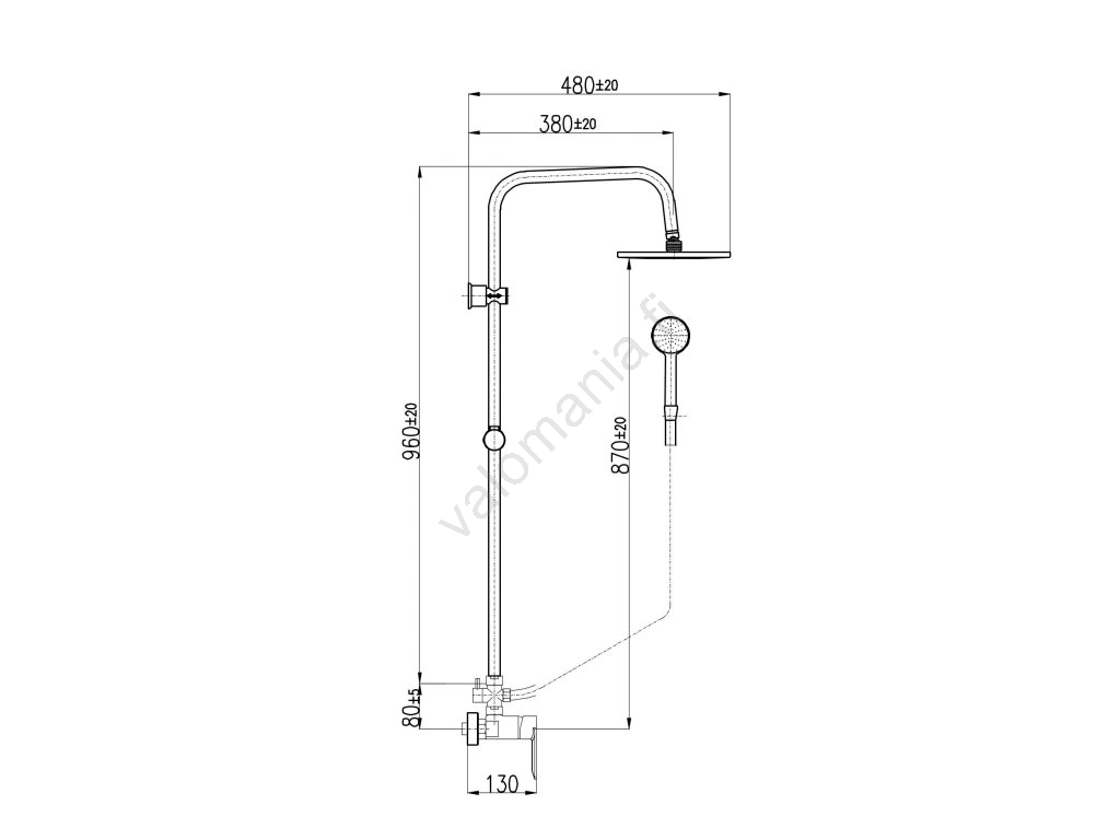 • Setti sisältää: suihkuhanan, muovisen käsisuihkun (halkaisija 103 mm), muovisen sadesuihkun (halkaisija 230 mm), muovisen suihkuletkun (1500 mm), suihkutangon.
