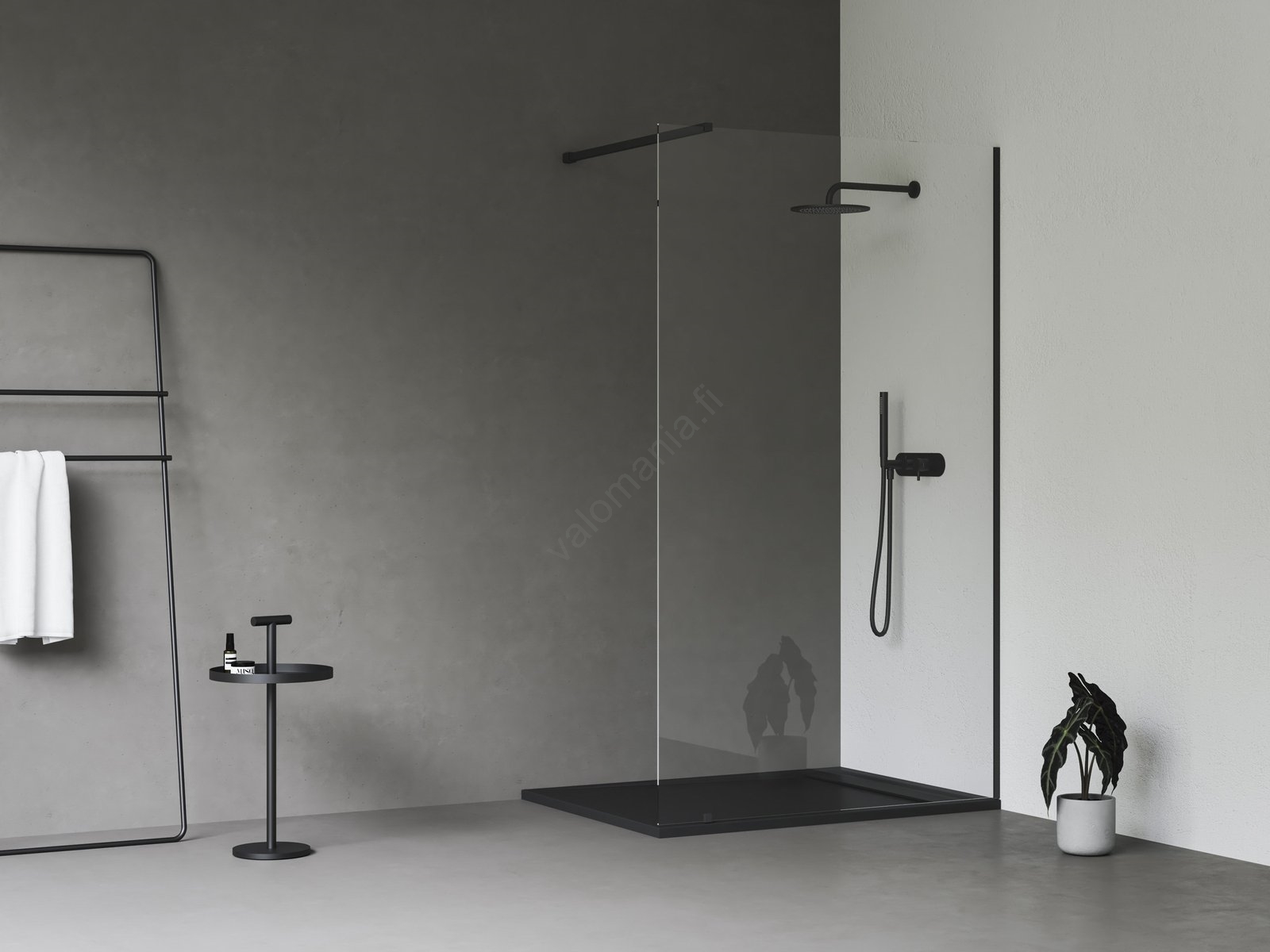 • Walk-In Wall -suihkutila mustassa viimeistelyssä tarjoaa modernin ja avoimen sisäänkäynnin, jota voidaan mukauttaa tarpeen mukaan jopa 120 cm leveäksi.