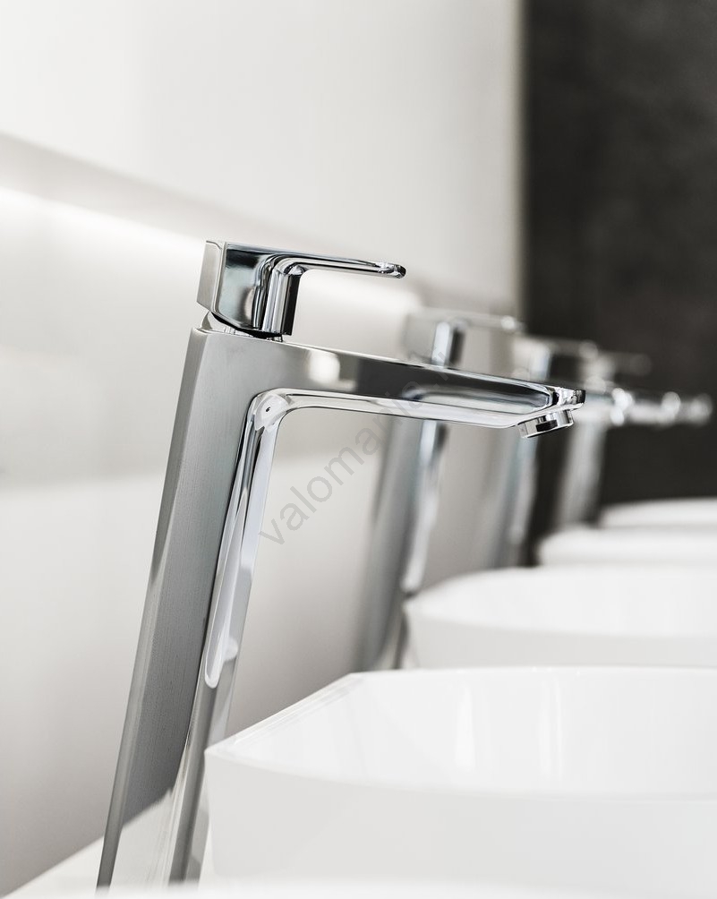 • Free-pesuallashana kiiltäväkromatulla pinnalla on erityisen pidennetty korkeus 334 mm, ihanteellinen tason päälle asennettaviin pesualtaisiin.