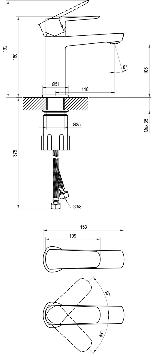 • 160 mm:n korkeus on ihanteellinen tavallisiin pesualtaisiin, ja joustavat 450 mm:n (G3/8) liitosletkut tekevät asennuksesta vaivattoman.