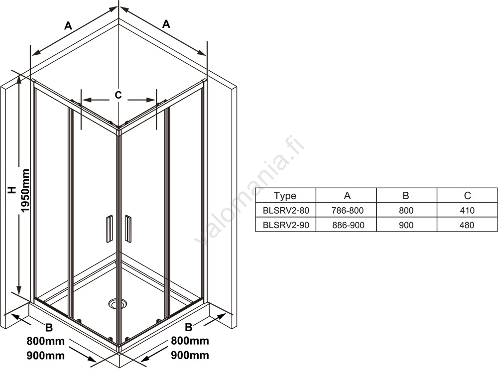 • Korkeudeltaan 195 cm oleva kulmasuihkukaappi on varustettu liukuvalla avausjärjestelmällä, joka muodostuu kahdesta kiinteästä ja kahdesta liukuvasta osasta.
