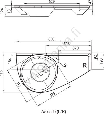 • Altaan mitat ovat 85 x 45 cm, mikä mahdollistaa asennuksen myös kapeampiin tiloihin, esimerkiksi Avocado-ammeen yläpuolelle.