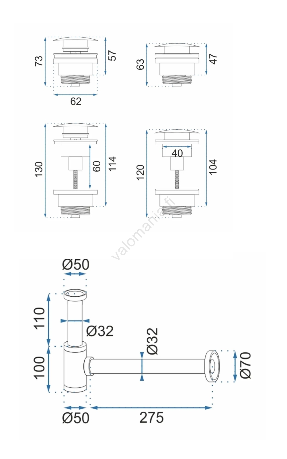 • Korkealaatuinen messinkinen sifoni, jossa on universaali pesualtaan CLICK-CLACK-tyhjennys.
