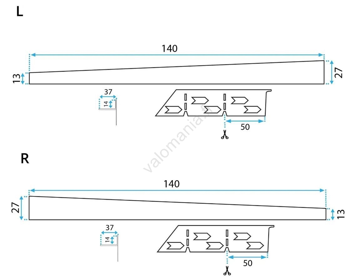 • 140 cm pitkä kaltevuuslista, suunniteltu vasenpuoleiseen asennukseen.