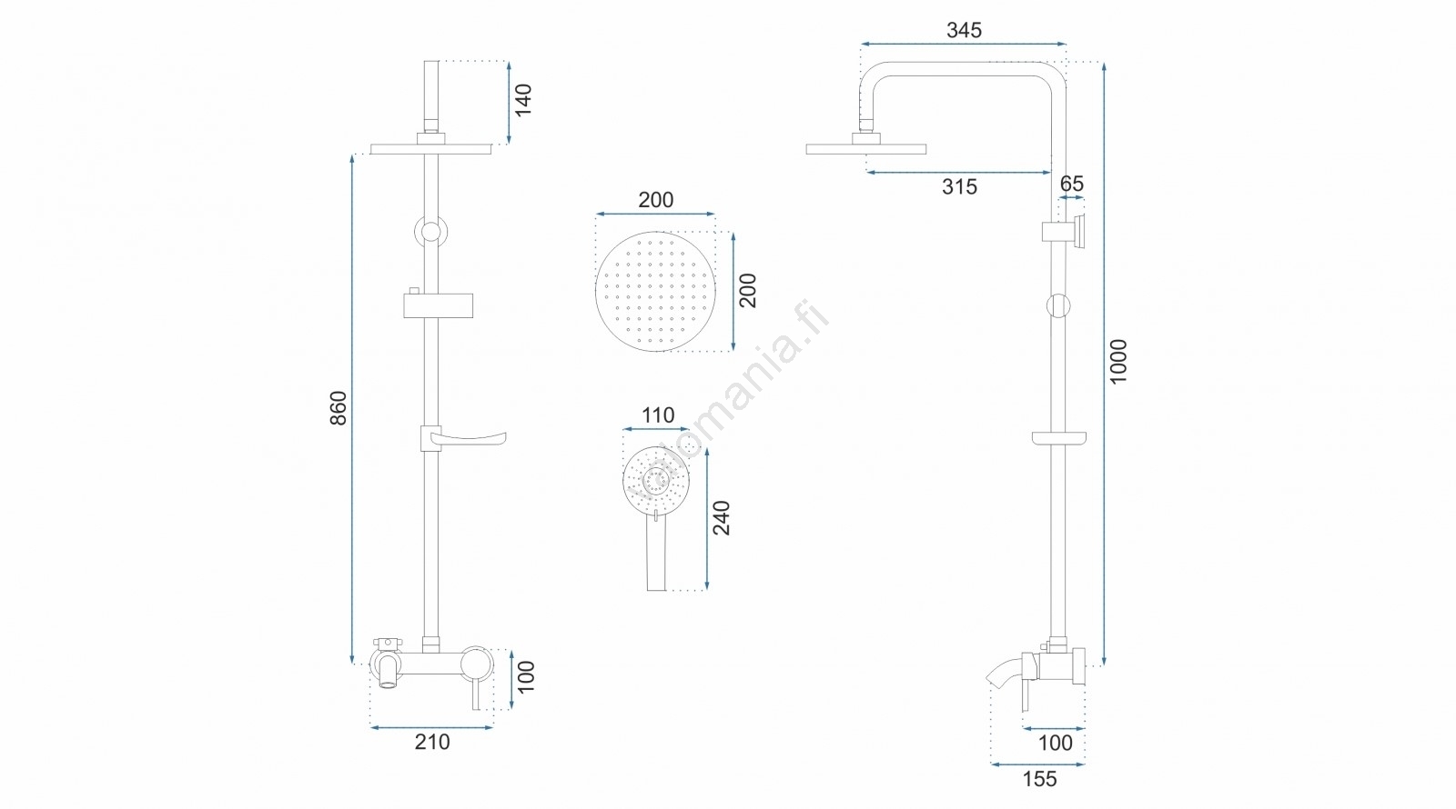 • ABS-muovinen käsisuihku ja teräksinen pääsuihku.