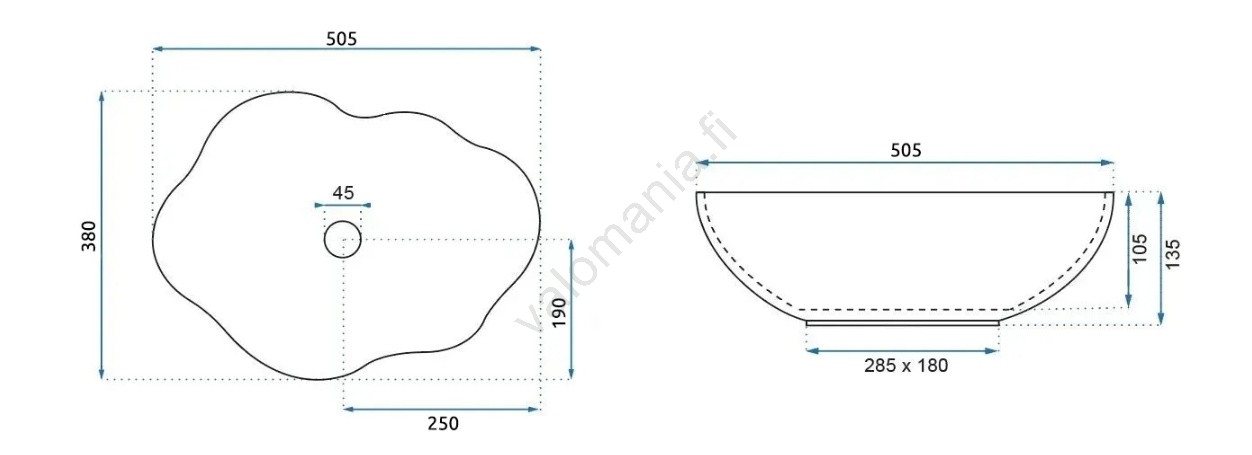 • Moderni ja tyylikäs pesuallas ilman ylivuotoaukkoa.
