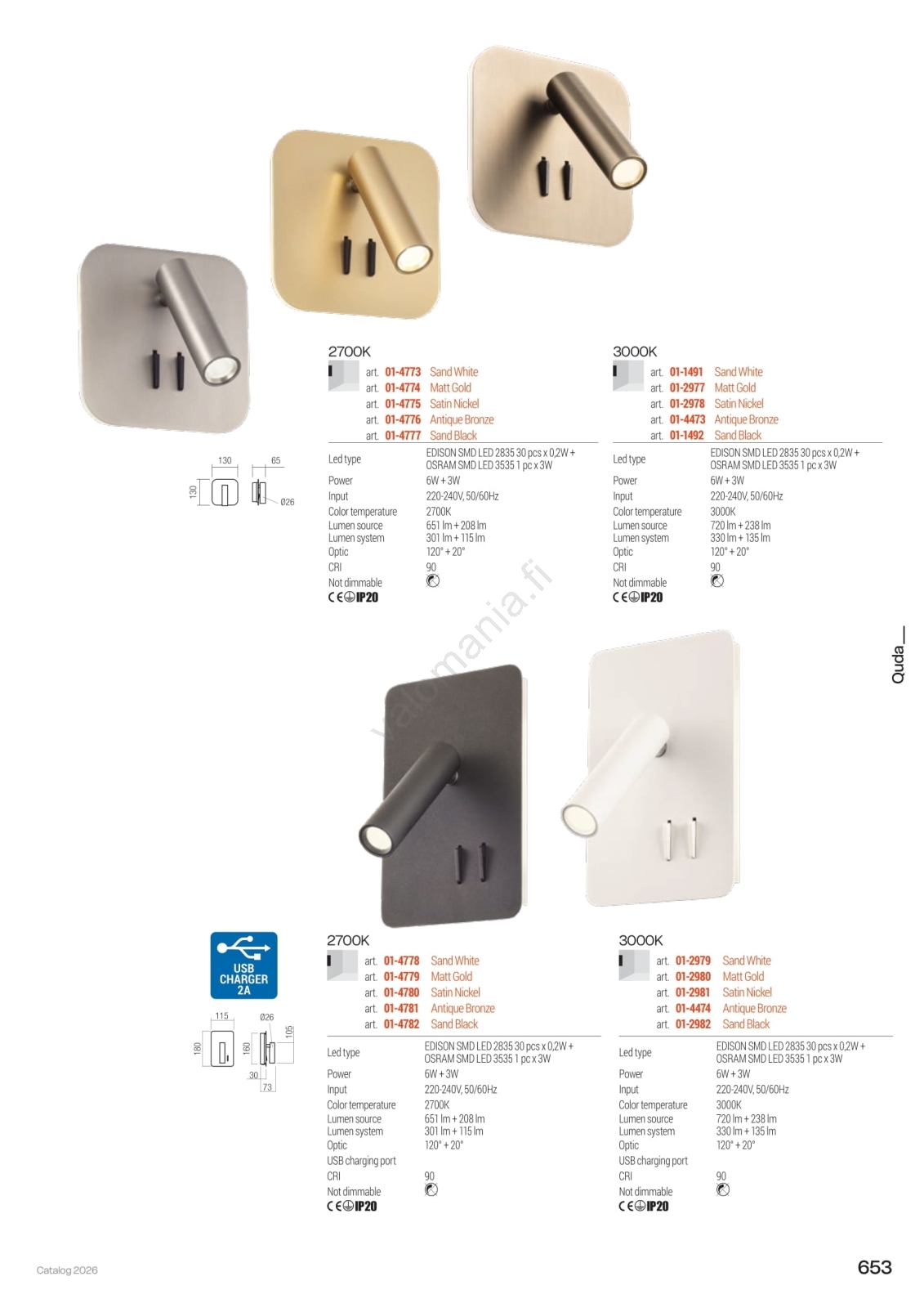 Redo 01-1491 - LED-seinävalaisin QUDA LED/6W/230V + LED/3W CRI 90 valkoinen | Valomania