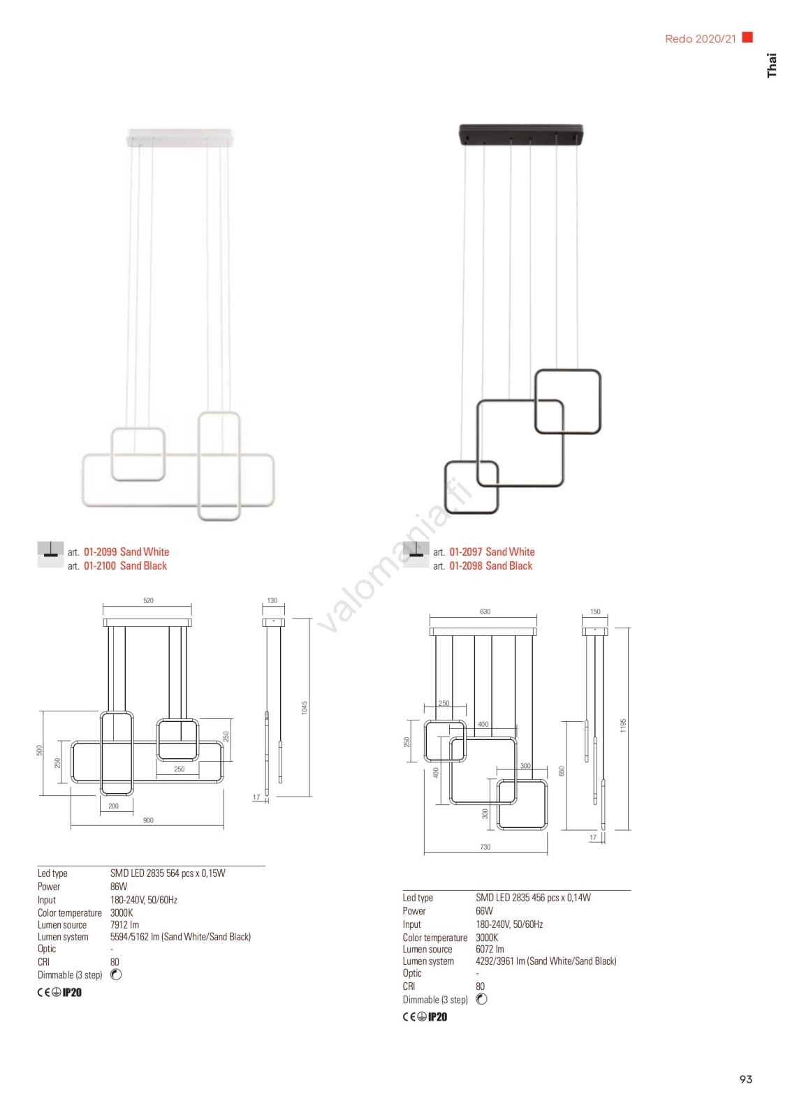 • Redo 01-2099 - THAI himmennettävä LED-riippuvalaisin vaijerilla, 86 W, 230 V, valkoinen