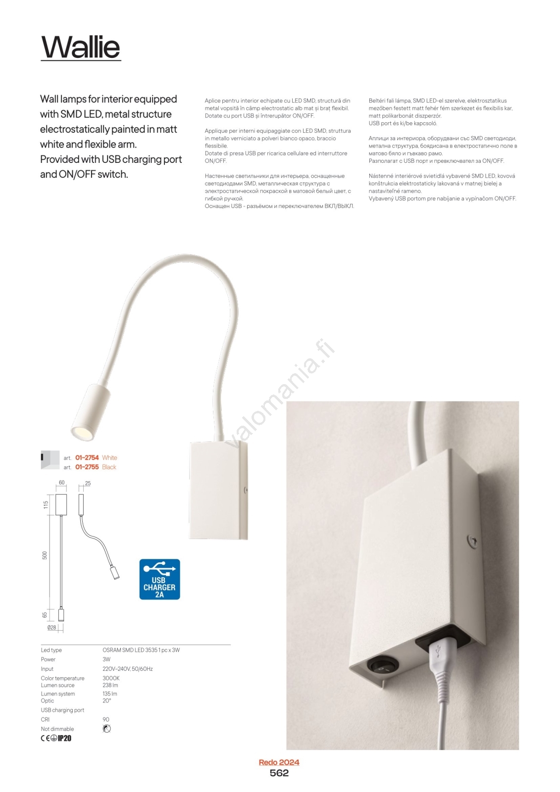 Redo 01-2754 - WALLIE LED joustava lamppu LED/3W/230V USB CRI 90 valkoinen | Valomania