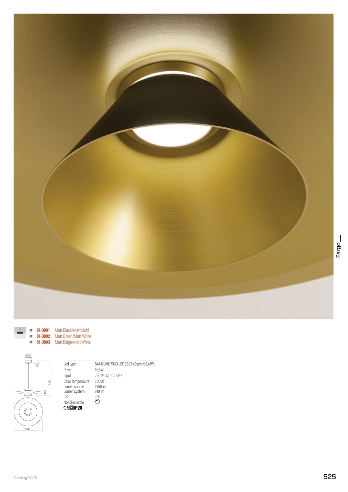 • Redo 01-3001 - FARGO LED-riippuvalaisin vaijerilla, 16,5W/230V, CRI 90, Ø 50 cm, musta/kultainen