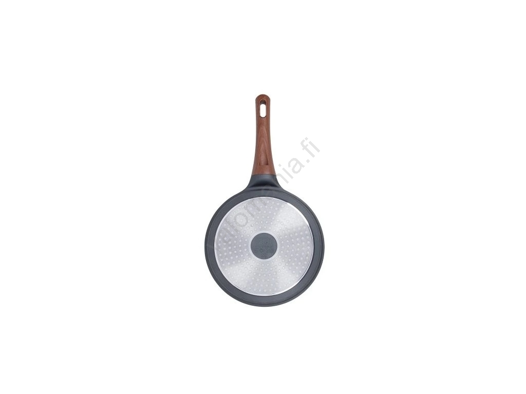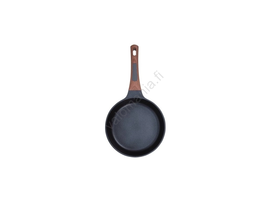 • Ergonominen kahva Soft-Touch-pinnalla ja puukuvioinnilla tarjoaa miellyttävän otteen ja varman käsittelyn, lisäksi pannu näyttää tyylikkäältä.