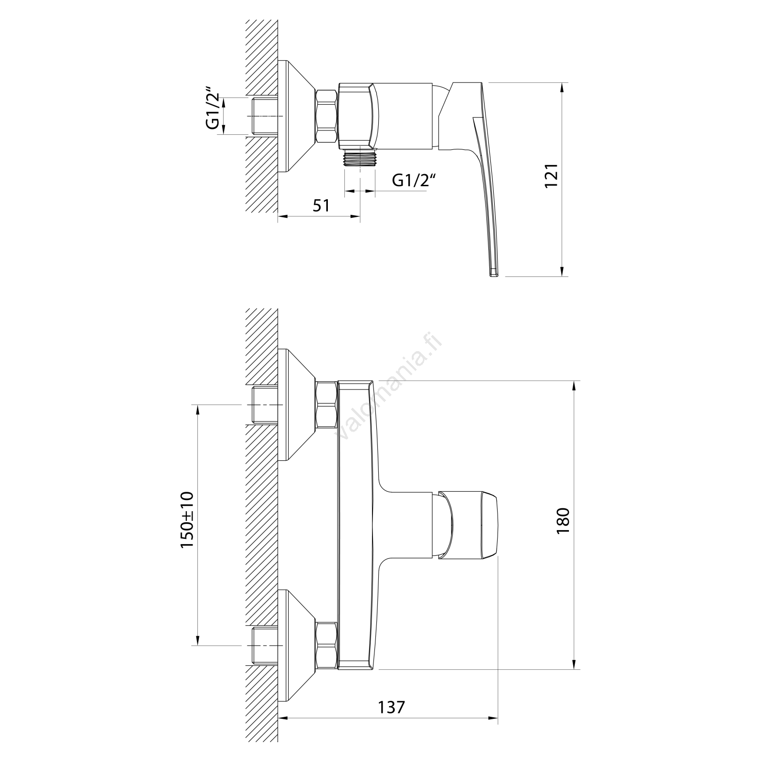 • Seinäasenteinen suihkuhana on valmistettu messingistä.