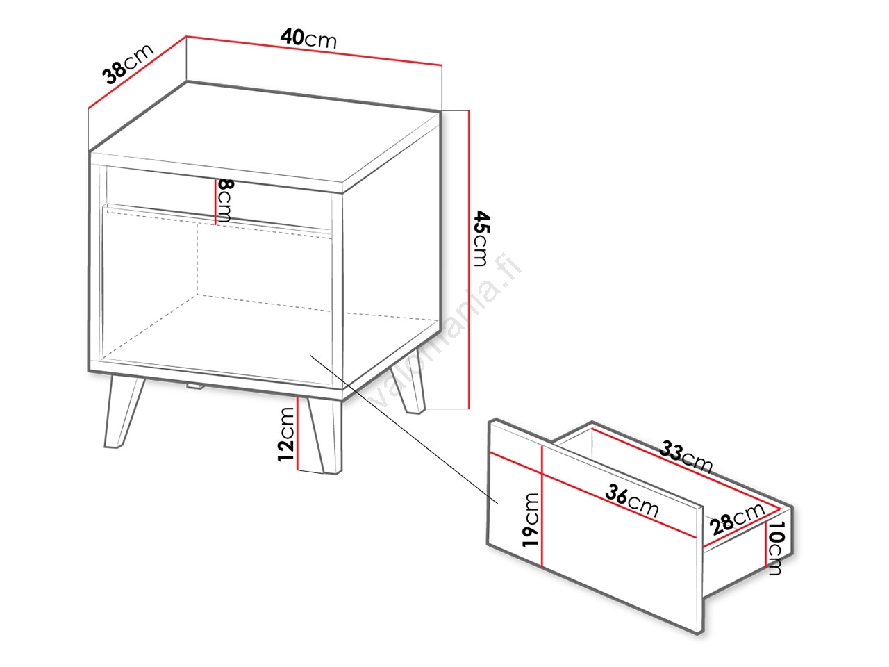 • Jalat: muovia (korkeus 12 cm).