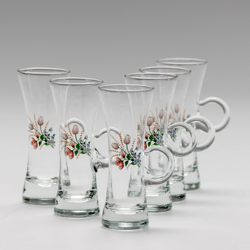 Setti 6x liköörilasi kahvalla läpinäkyvä kukka-aihe nro. 3