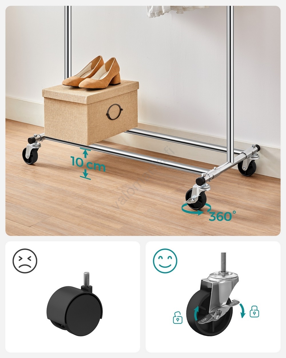 • 4 kestävää ja 360 asteen pyörivää PP-pyörää (2 jarrullista) helpottavat siirtämistä tai pitävät koko telineen paikoillaan.