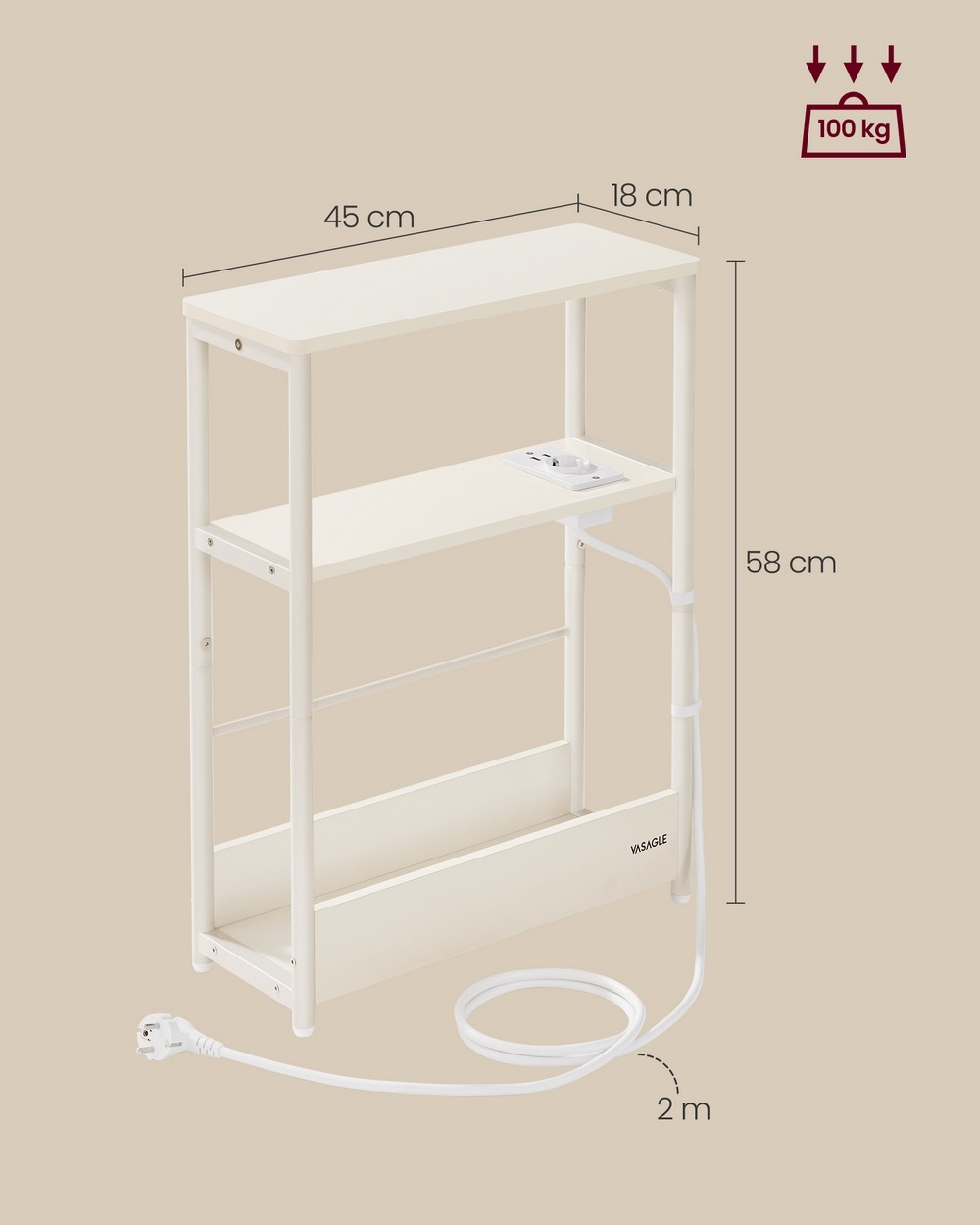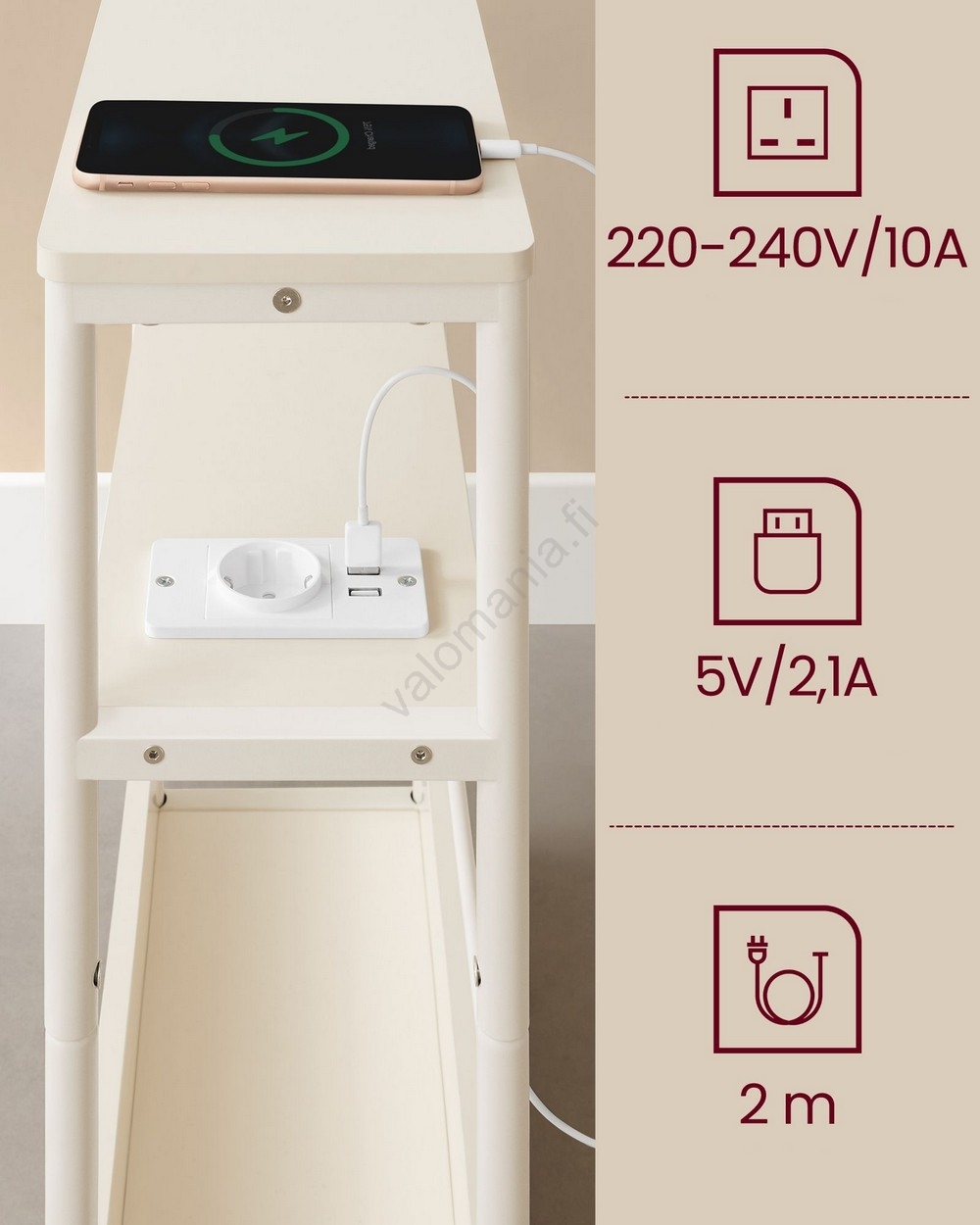 Sivupöytä ROD, sisäänrakennetulla pistorasialla ja USB-porteilla, valkoinen/kerma | Valomania