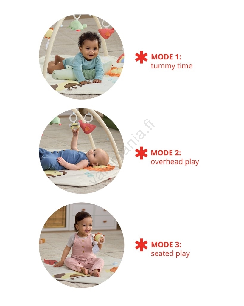 • Tarjoaa 3 leikkiasentoa: vatsallaan, selällään ja istuen.