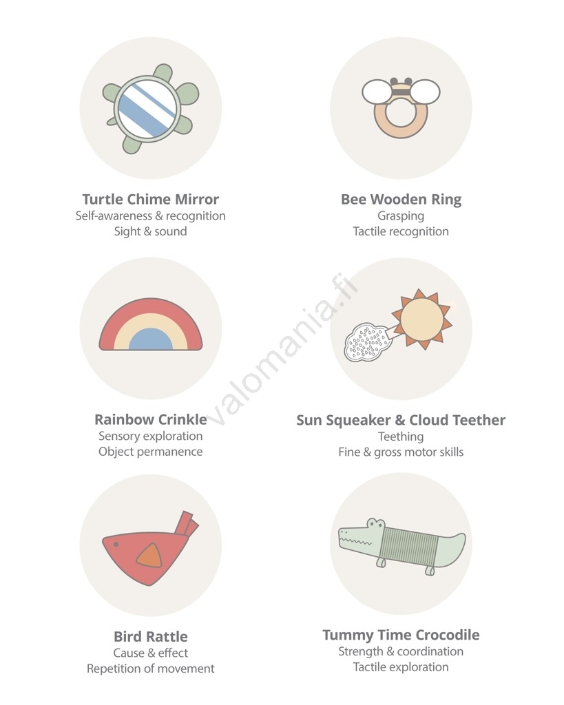• Sisältää 5 roikkuvaa lelua, kuten peilin kanssa varustetun kilpikonnan, vinkuvan auringon purulelun kanssa tai rapisevan sateenkaaren.