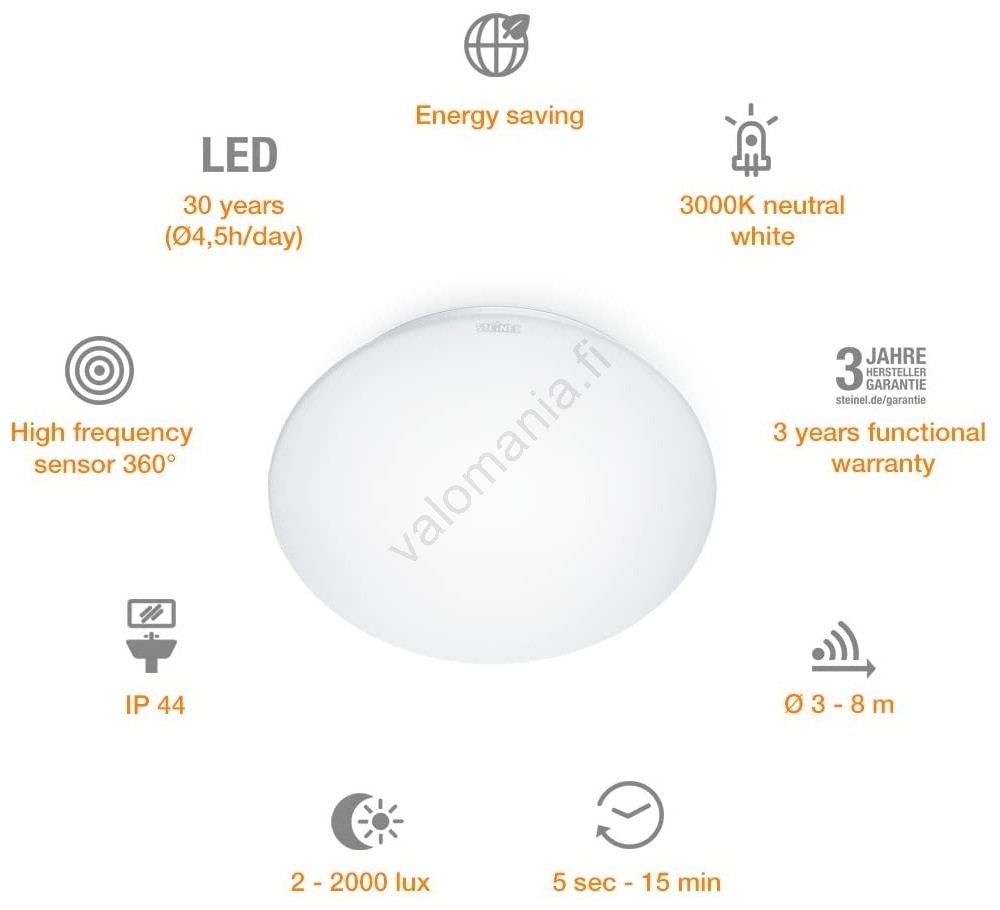 STEINEL 035105 - LED-valo anturilla kylpyhuoneeseen RS 16 LED/9,5W/230V IP44 | Valomania