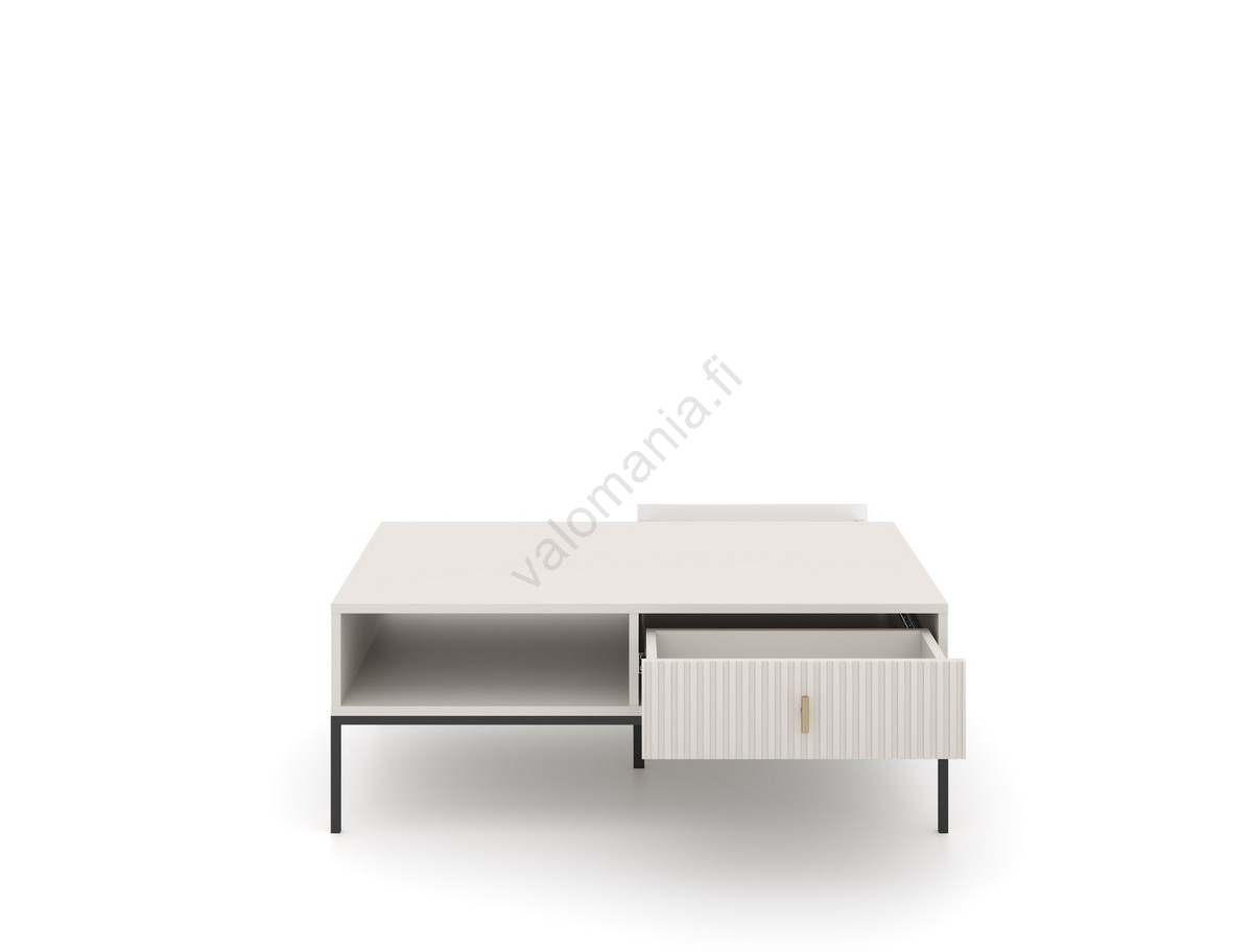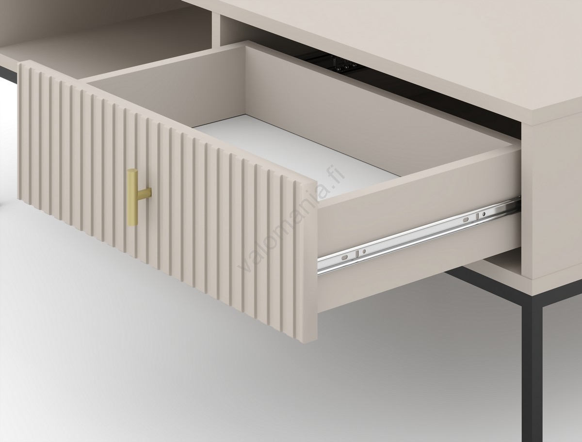 • Siinä on yksi avoin lokero ja kaksi laatikkoa, joiden etuosissa on pystysuorat uurteet, mikä luo hienostuneen visuaalisen efektin.