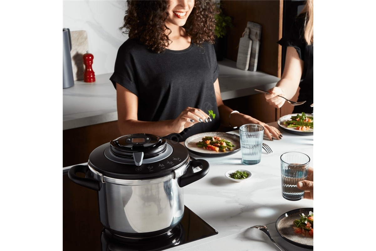 • Mahdollistaa ruoanlaiton jopa kaksi kertaa nopeammin kuin tavallisessa kattilassa painejärjestelmän ansiosta.