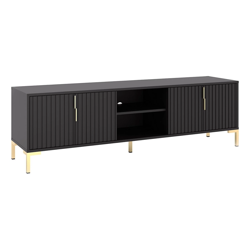 • Siinä on kaksi suljettua sivutaskua, joissa kummassakin on kaksi ovea symmetrisillä vetimillä ja uurretuilla pinnoilla, sekä keskellä kaksi avonaista hyllyä, joissa on kaapelireikä.