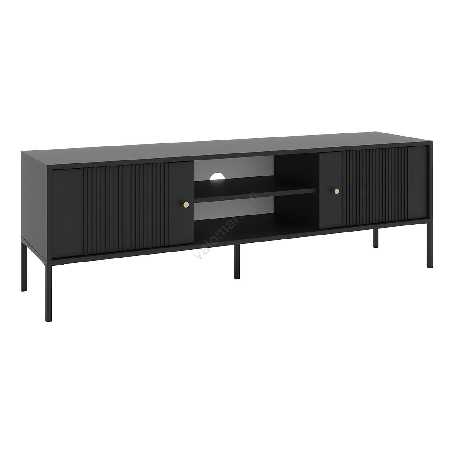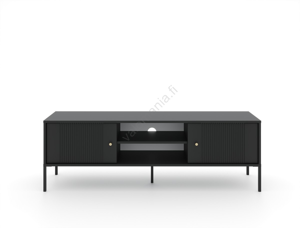 • Siinä on kaksi suljettua sivuosastoa uurretuilla ovilla ja kaksi avointa hyllyä, joista keskimmäisessä on johtojen läpivienti.