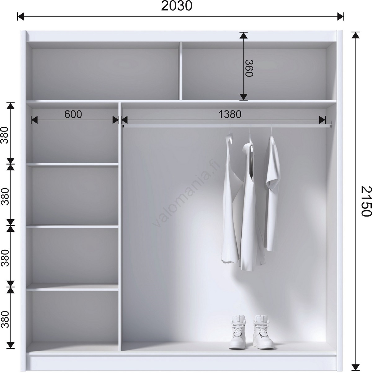 • Kaapissa on 4 avointa hyllyä, vaatetanko sekä 2 ylähyllyä laukkujen ja sesonkiesineiden säilytykseen.