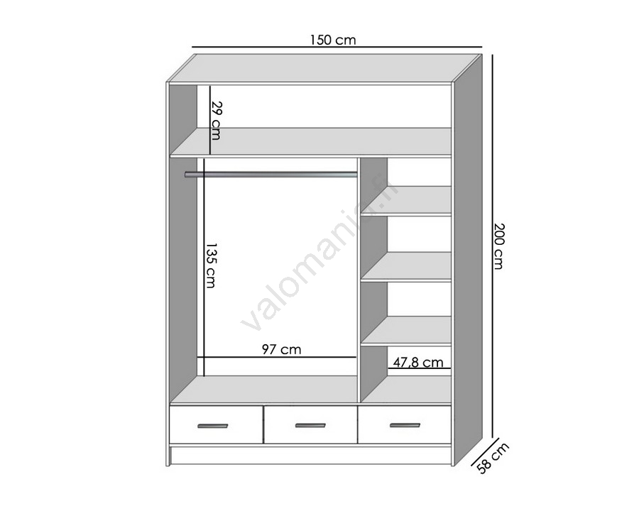 • Kaapissa on 4 avointa hyllyä, 3 laatikkoa, vaatetanko sekä ylähylly laukkujen ja sesonkiesineiden säilytykseen.