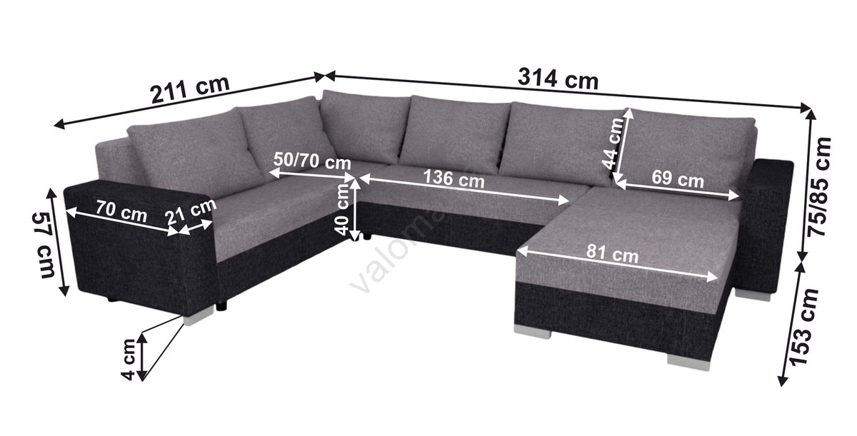 • Verhoiltu monikäyttöinen U-muotoinen avattava sohvasarja YORK harmaa/musta