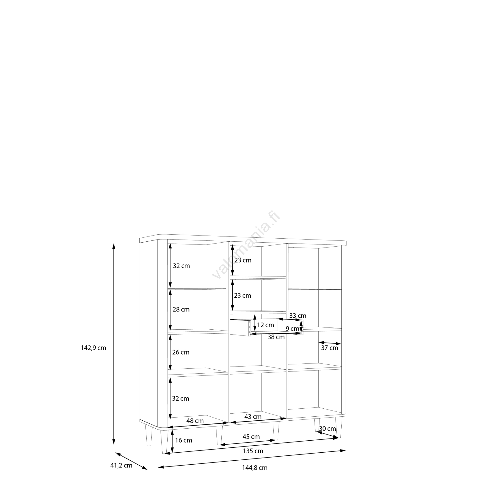 • Ylälevy on riittävän tilava koristeiden, elektroniikan ja muiden tarpeellisten tavaroiden säilytykseen.