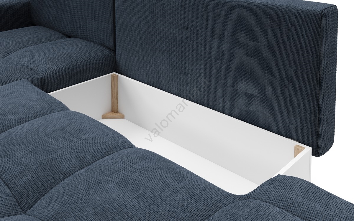 • ALMADA avattava verhoiltu L-mallinen kulmasohva säilytystilalla, oikeanpuoleinen, sininen