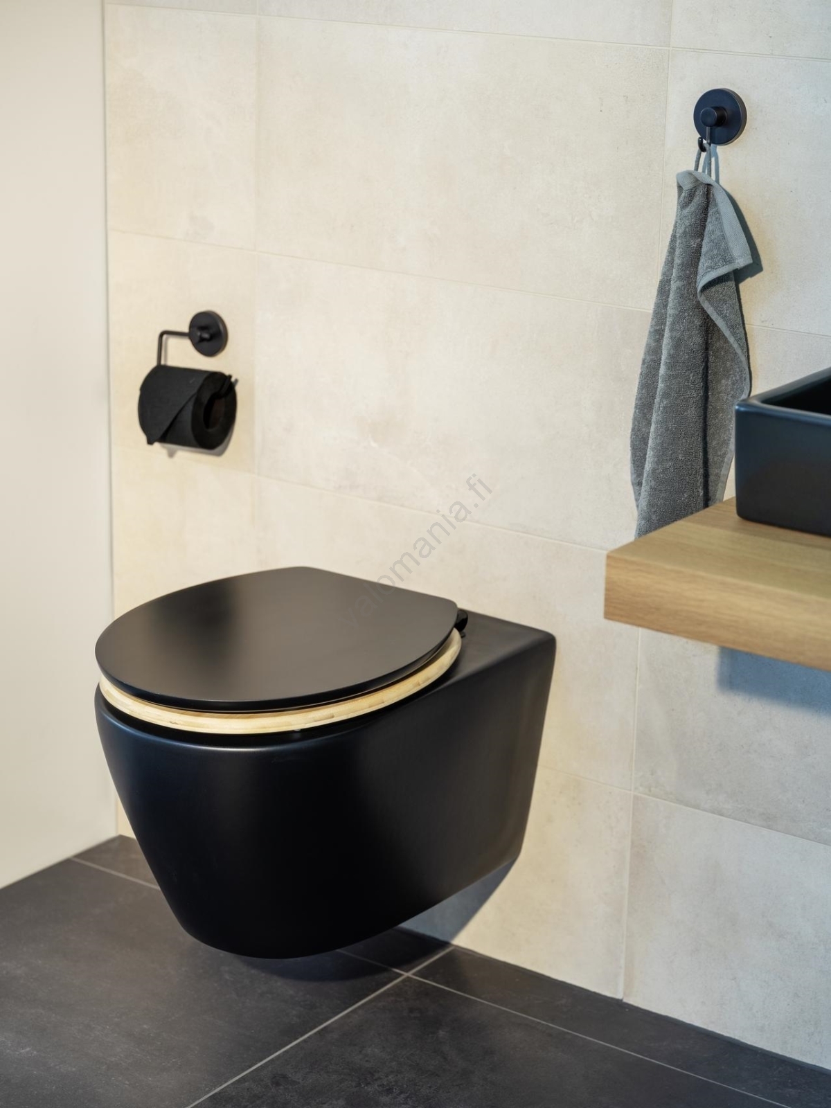 • Moderni tumma–vaalea kontrasti luo kylpyhuoneeseen tyylikkään ilmeen.